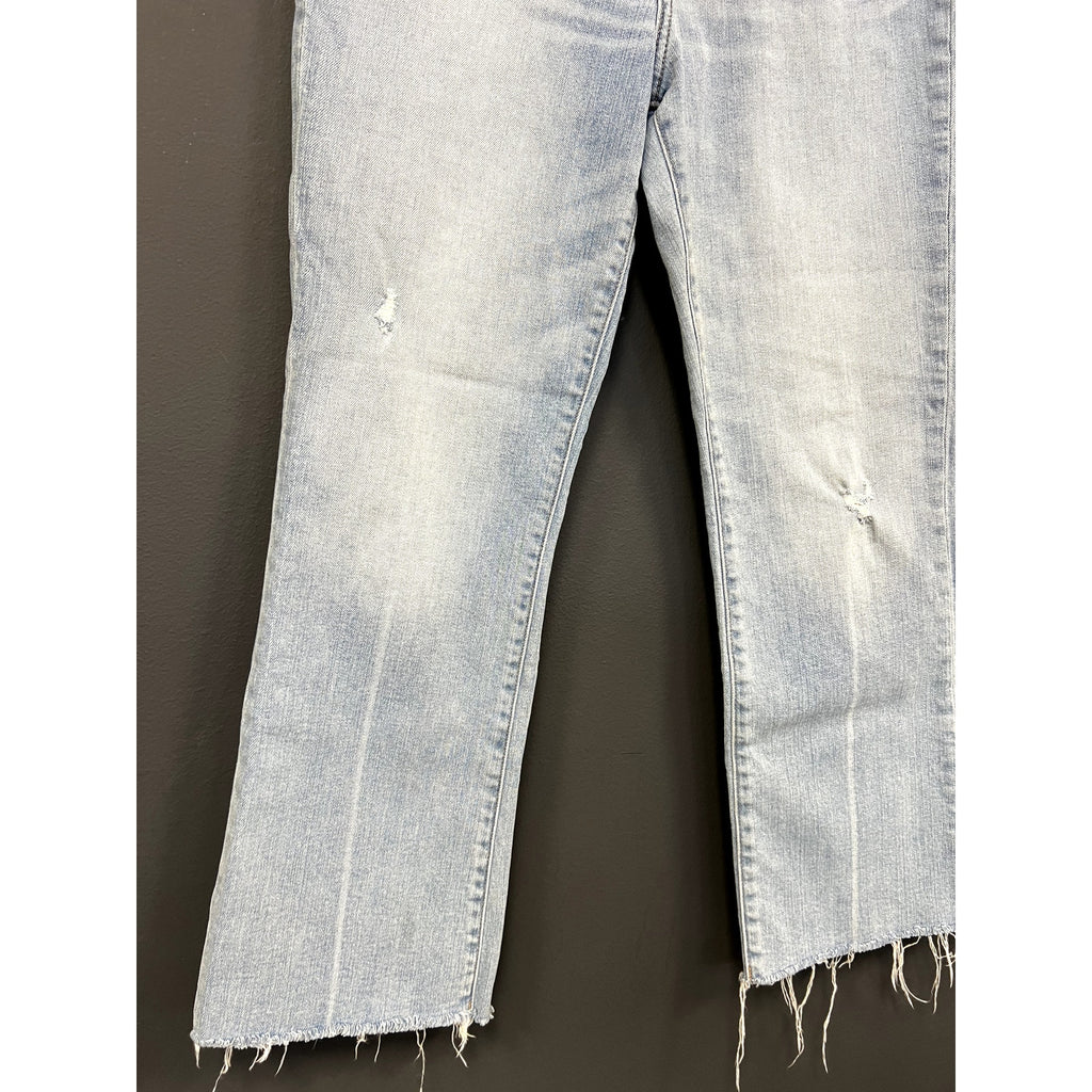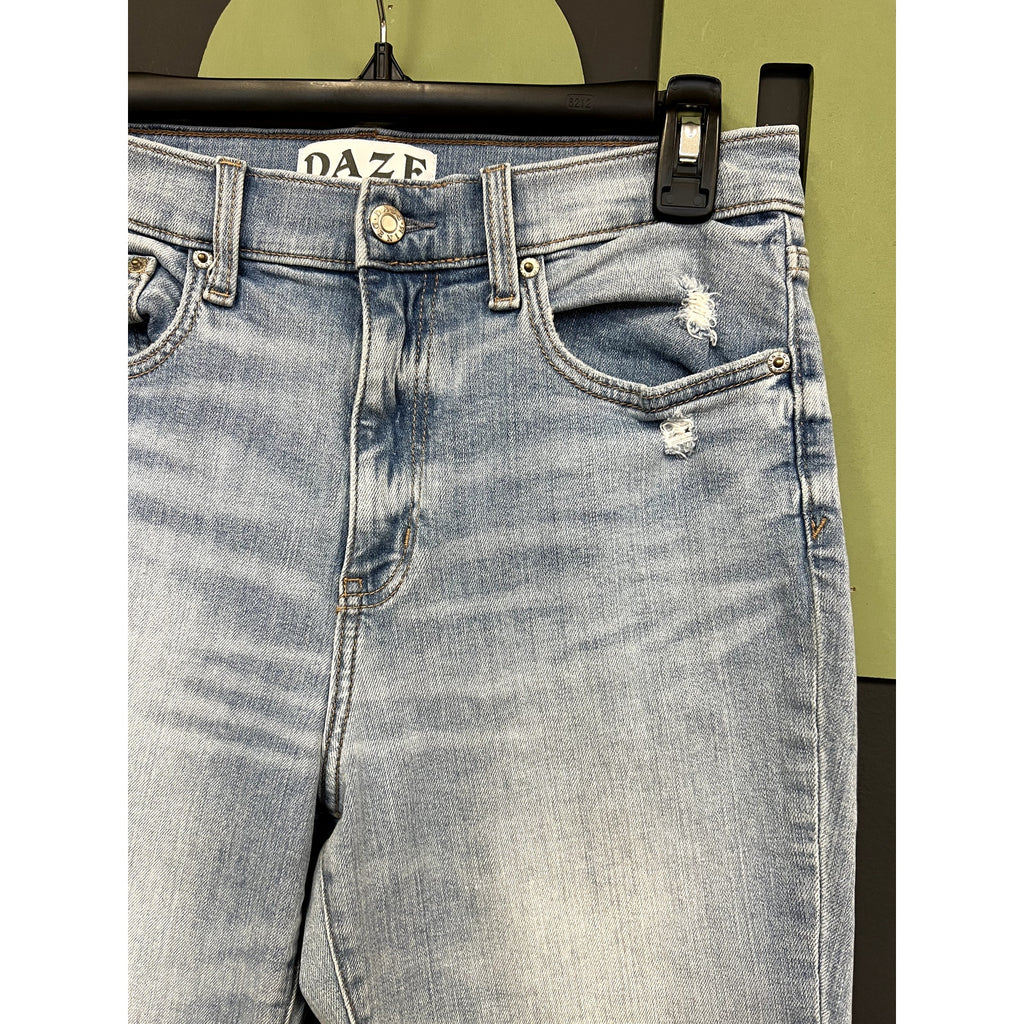 Keywords: Daze Denim jeans, cropped kick flare jeans, light wash denim, high rise jeans, raw hem jeans, women’s trendy denim, size 29 jeans, modern flare jeans
