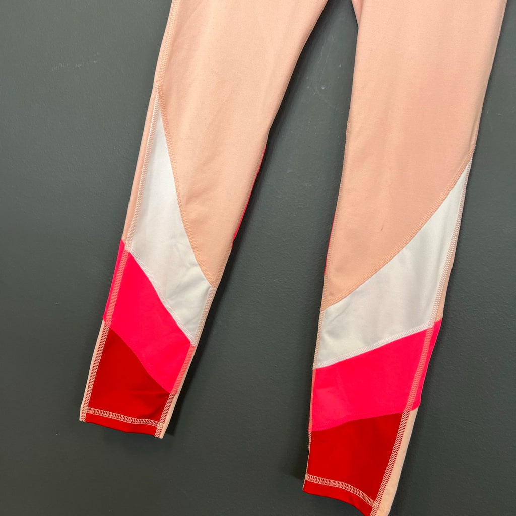 These peach-colored youth girls' leggings feature a fun pink and red trim at the bottom. Made from soft, stretchy fabric, they offer a comfy fit for play or everyday wear. Stylish, vibrant, and easy to move in!