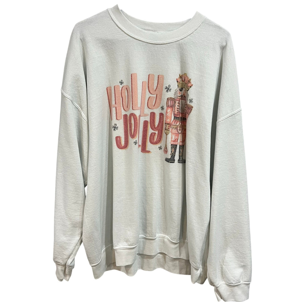 Get festive and fun in this white sweatshirt featuring a cheerful “Holly Jolly” graphic and a pink nutcracker front and center. It’s the perfect mix of holiday spirit and playful style—ready to sleigh all season long!