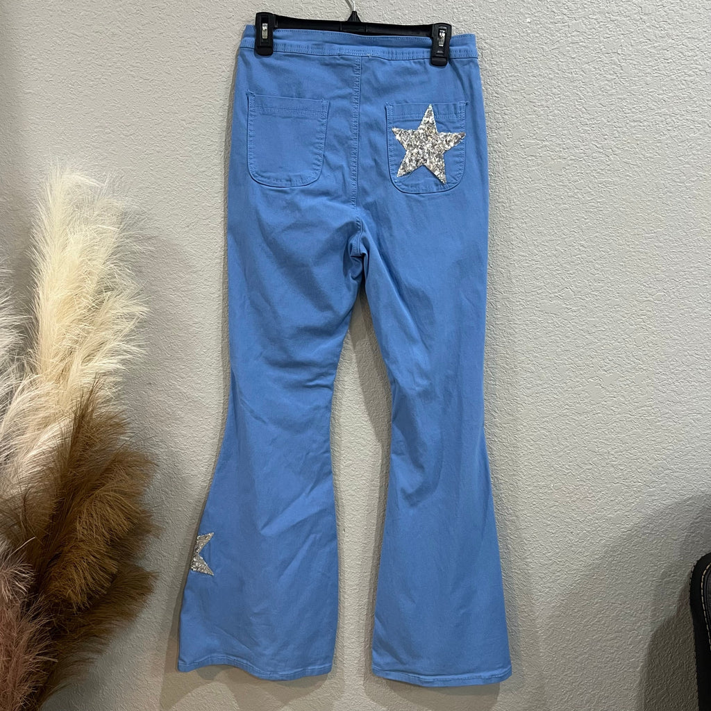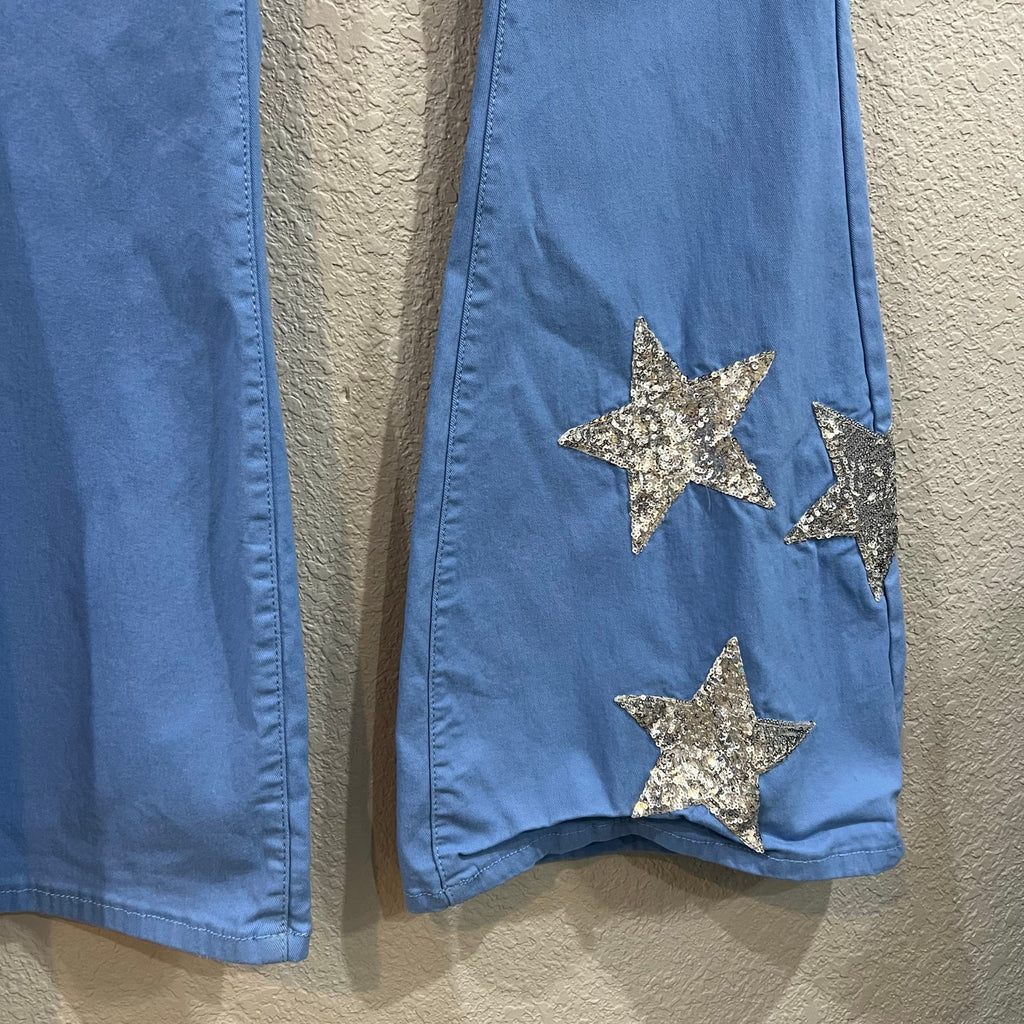 Make a sparkling statement in these ultra-stretchy Judith March Periwinkle Flare Jeans. With a bold, wide-leg flare and playful sequin star patches on the lower legs and back pocket, these jeans are made for the spotlight. The soft, super-stretch fabric hugs in all the right places while keeping you comfy from day to night. Perfect for concerts, festivals, or anytime you’re feeling a little extra—because denim should never be boring.