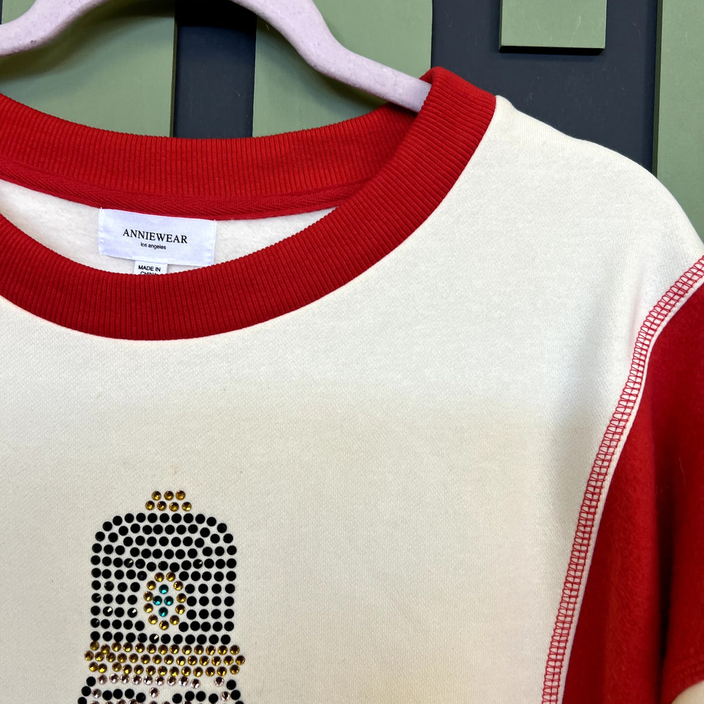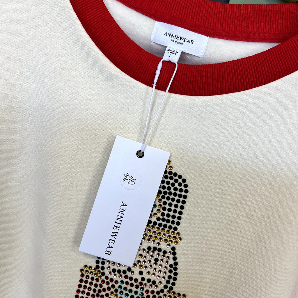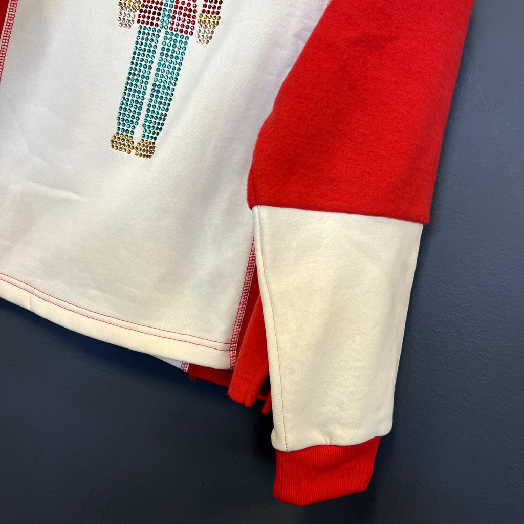 This NWOT Anniewear cream and red color block sweater is a festive statement piece with charming detail. The rhinestone nutcracker graphic front and center adds sparkle and holiday personality, making it a standout for seasonal wear.