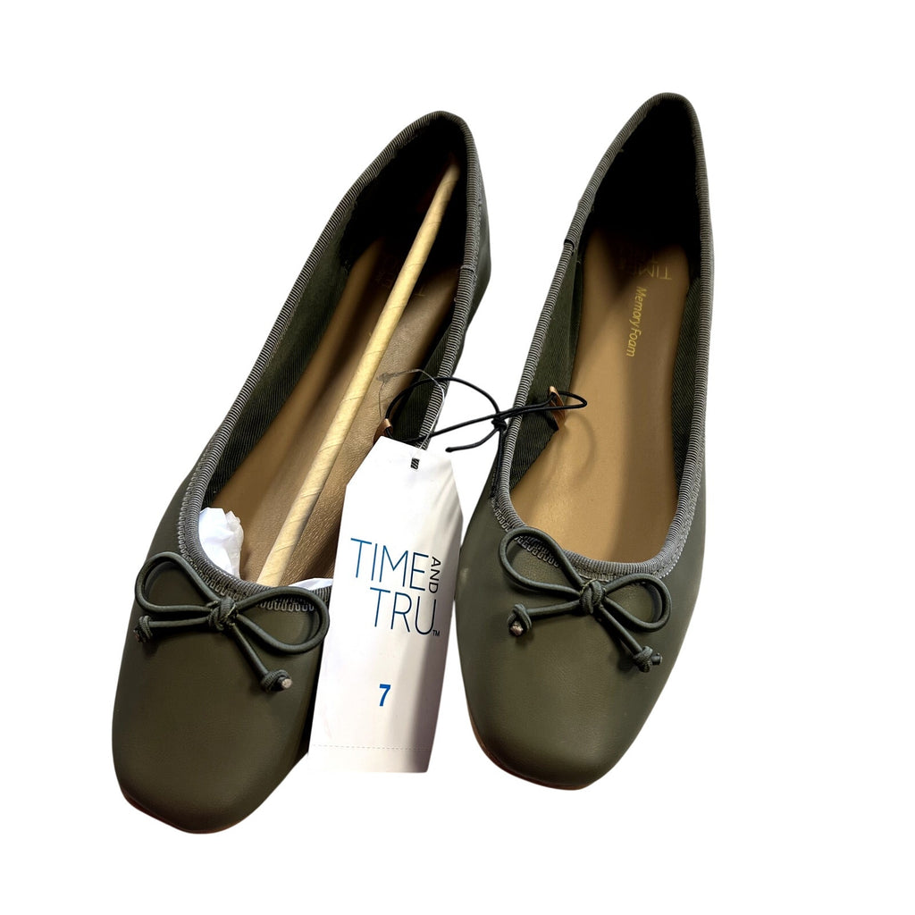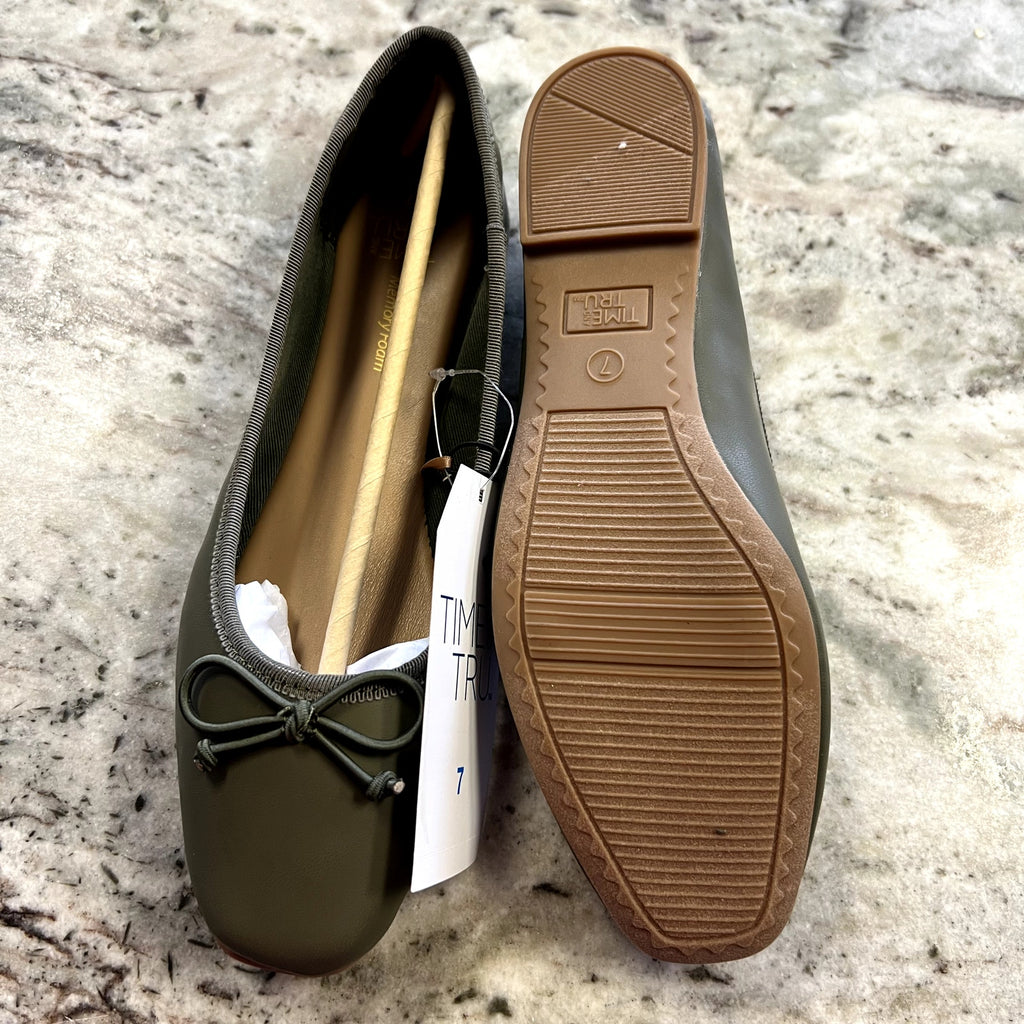 Keywords: Time and Tru ballet flats, olive green flats, slip‑on women’s shoes, new with tags footwear, versatile everyday flats, size 7 women’s shoes