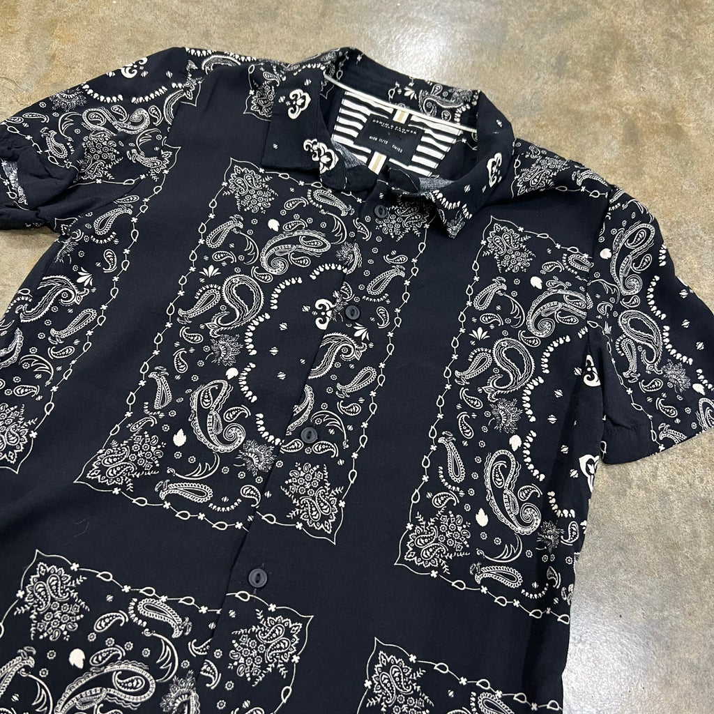 This stylish Denim & Flower by Ricky Singh black paisley button down top (boys size 11/12) is the perfect mix of cool and classic. Featuring an allover paisley print on a sleek black background, this shirt brings a trendy yet polished vibe that can be dressed up or kept casual. The lightweight fabric makes it comfortable for everyday wear, while the button front design adds that timeless look. Perfect for school, family photos, or a special occasion, this boys casual button down shirt is a versatile wardrobe must-have!