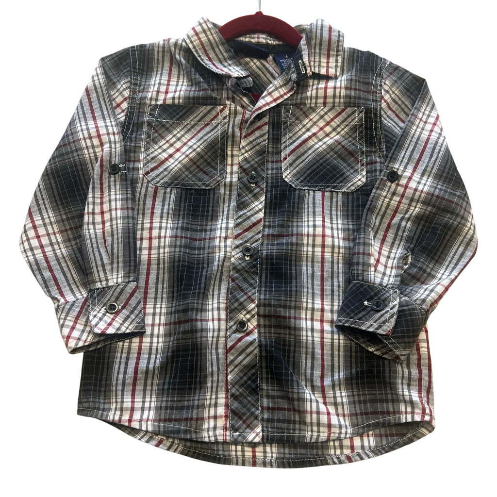This cozy boys gray and black flannel button down (size 4) is a timeless staple with a pop of style. Made with soft fabric, it features a classic plaid pattern in gray and black with subtle hints of red throughout. The button-down design makes it easy to wear on its own or layered over a tee for extra warmth. This toddler boys plaid flannel shirt is perfect for school, family outings, or casual everyday wear.