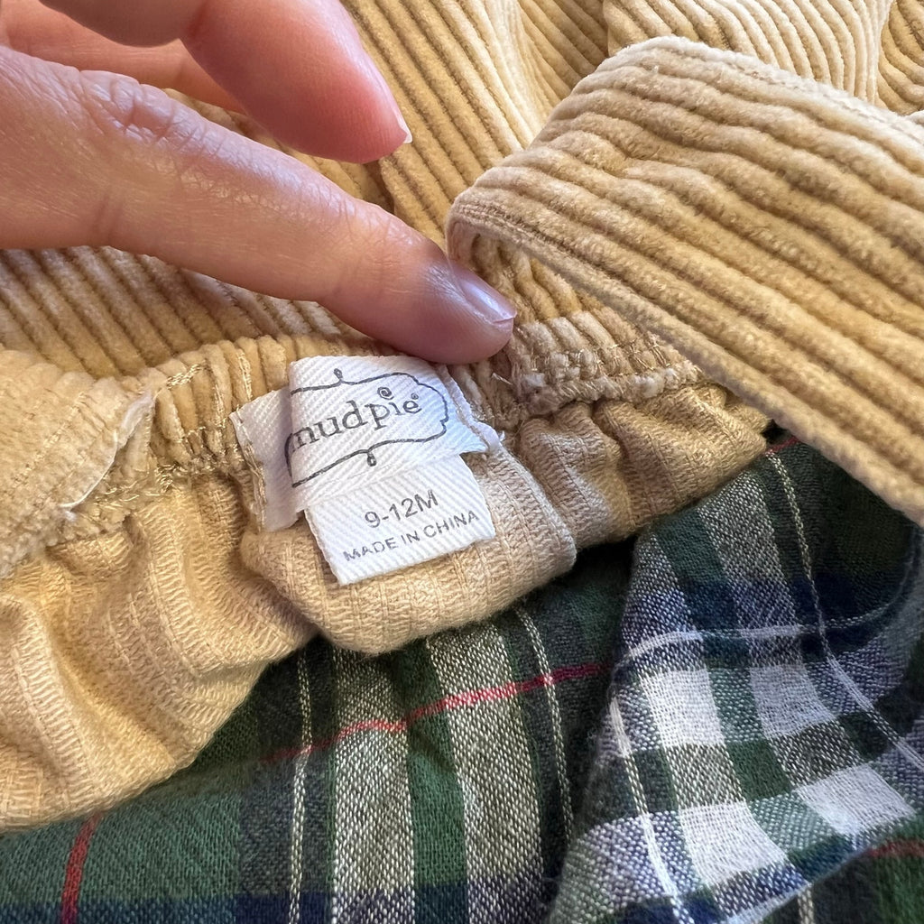 MudPie Corduroy Overalls with Plaid Undershirt – 9-12 Months