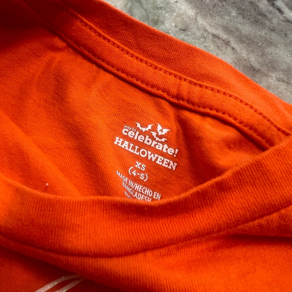 This Girls “Spooky Cute” Halloween Skeleton Graphic Tee (Size XS) is the perfect mix of festive and fun! The bright orange base makes it stand out, while the center graphic features adorable dancing skeletons with bows surrounded by the phrase “I got this feelin’ inside my bones.” It’s playful, comfy, and just right for school parties, pumpkin patch days, or Halloween fun.