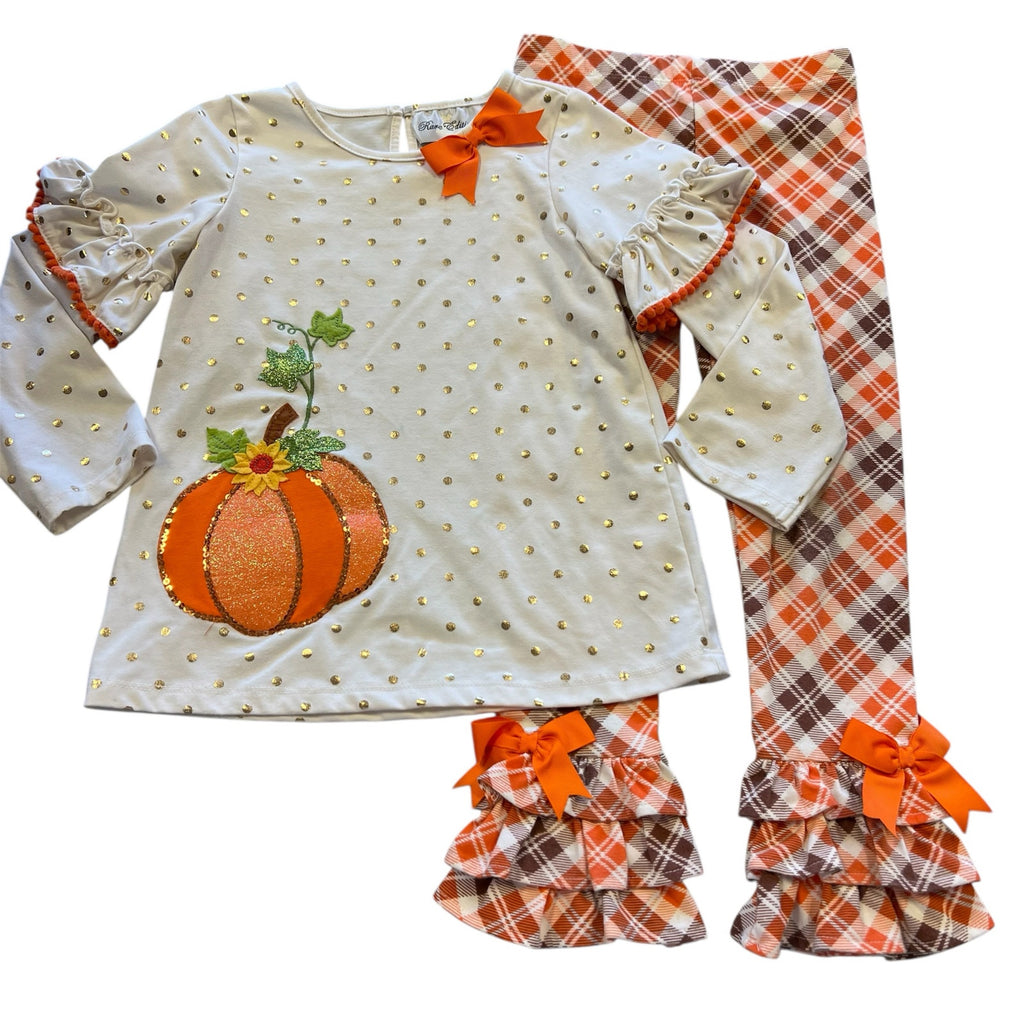 Keywords: Rare Editions girls outfit, Thanksgiving kids outfit, pumpkin fall outfit, girls size 6 clothing, plaid pants set, cute autumn outfit, girls holiday fashion, fall photo outfit.