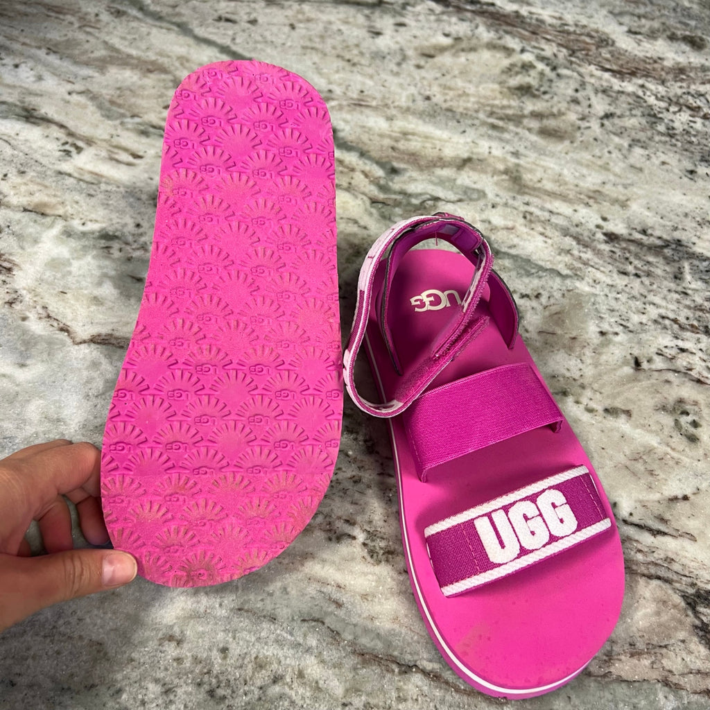 Keywords: UGG youth sandals, pink Allisa sandals, adjustable ankle strap shoes, comfortable kids sandals, hook-and-loop sandals, casual summer shoes, UGG logo sandals, size 2 youth
