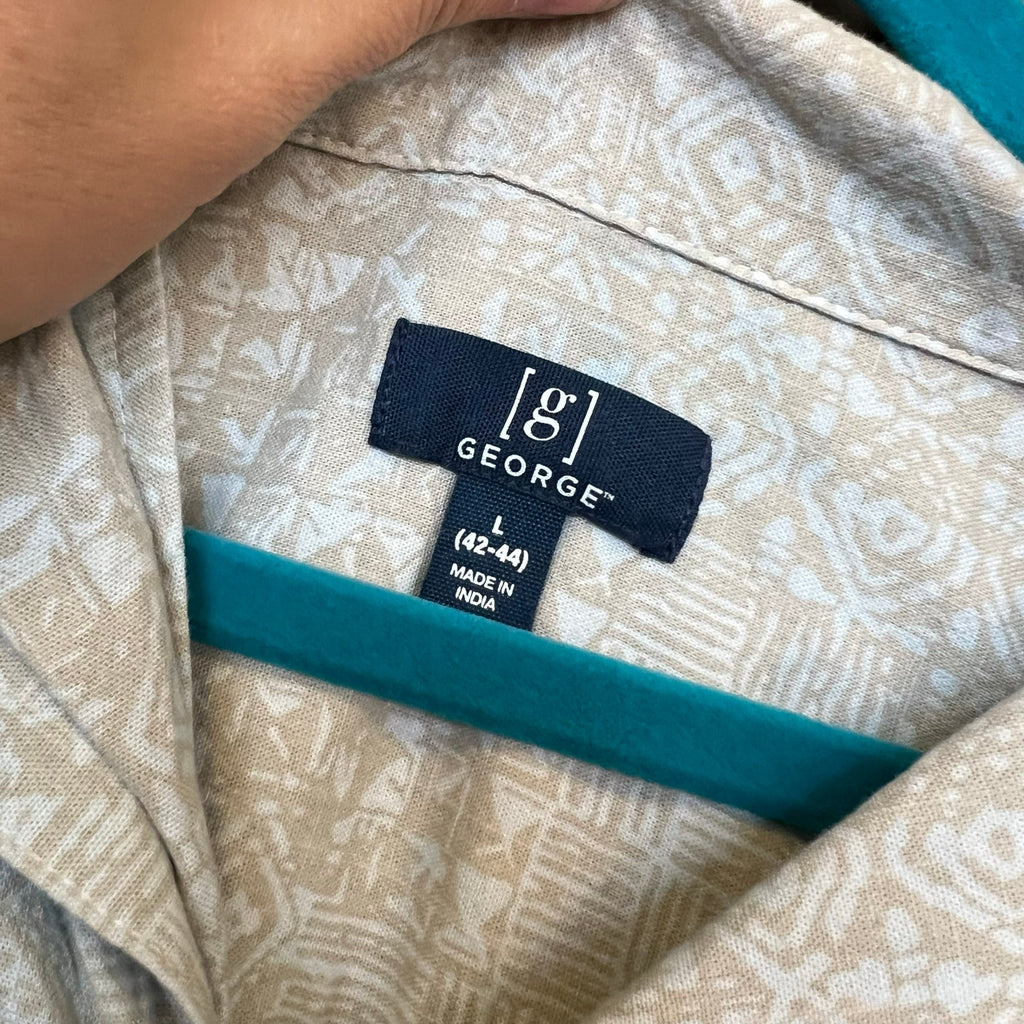 This George men’s light blue and tan Aztec linen button-down in size Large brings a relaxed, easygoing style to any wardrobe. The soft linen blend and subtle Aztec pattern make it a great choice for warm-weather days, casual outings, or laid-back weekends. Lightweight and breathable, it pairs well with jeans, chinos, or shorts for an effortless, polished look.