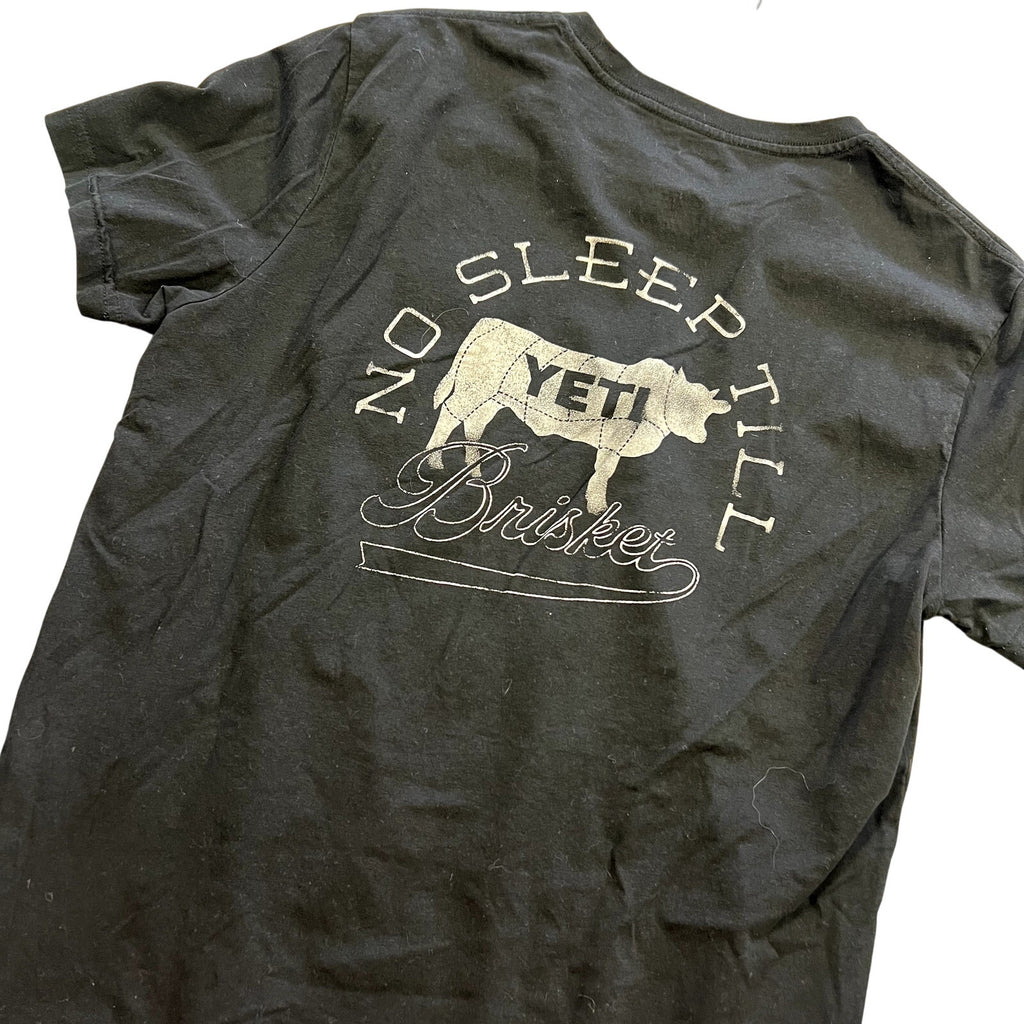 Keywords: Yeti graphic tee, black pocket t-shirt, leisurely outdoor tee, brisket graphic shirt, men’s medium tee, casual cotton tee