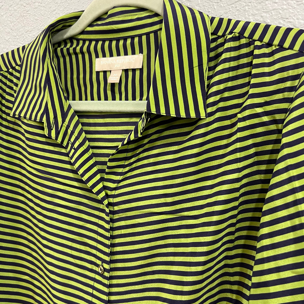 Vibrant stripes meet timeless elegance. This Banana Republic blouse features bold lime green and navy stripes in a classic button-down silhouette. Crafted from 100% silk, it offers a luxurious feel and a flattering drape. The long sleeves and tailored fit make it suitable for both professional settings and casual outings. Pair it with tailored trousers for the office or jeans for a relaxed weekend look.