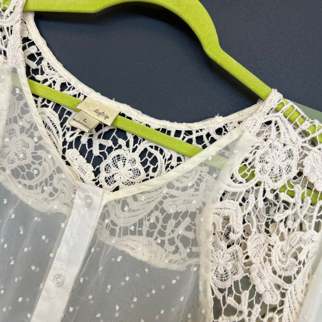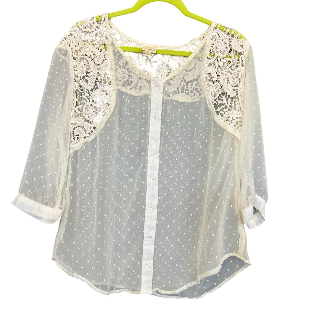 BKE Daytrip Lace Sheer Swiss Dot Button Down Blouse Large