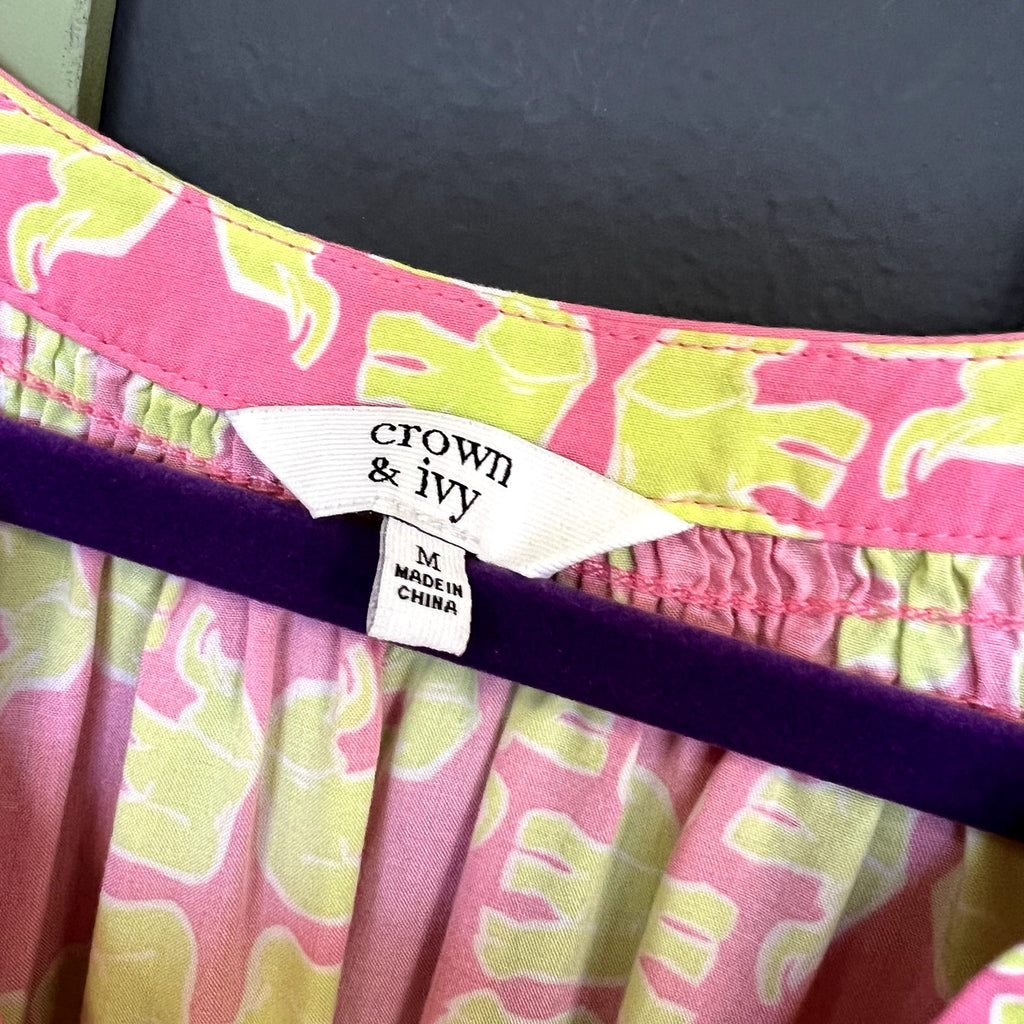 Crown + Ivy Pink + Yellow Elephant Print V-Neck 3/4 Sleeve Blouse Medium