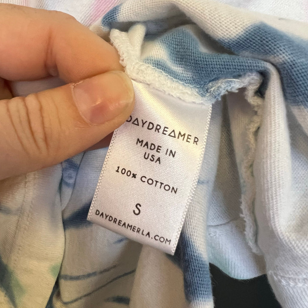 This Daydreamer tie-dye Pink Floyd long sleeve graphic tee in small is a soft, casual staple with a vintage-inspired vibe. The white base features subtle light blue tie-dye around the edges, giving it a relaxed, laid-back feel, while the iconic Pink Floyd graphic on the front adds a bold, retro touch.