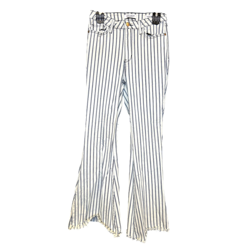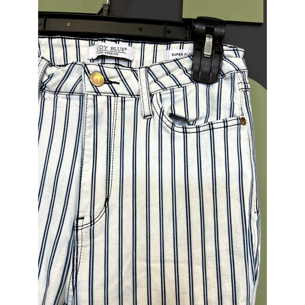 Stand out in these Judy Blue high-rise pinstripe super flare jeans in size 28. Featuring a crisp white base with navy pinstripes, these high-rise jeans offer a flattering fit that elongates the legs, while the super flare silhouette adds a retro-inspired, trendy touch. Perfect for pairing with heels, boots, or casual sneakers, they make a stylish statement for both casual and dressy occasions.