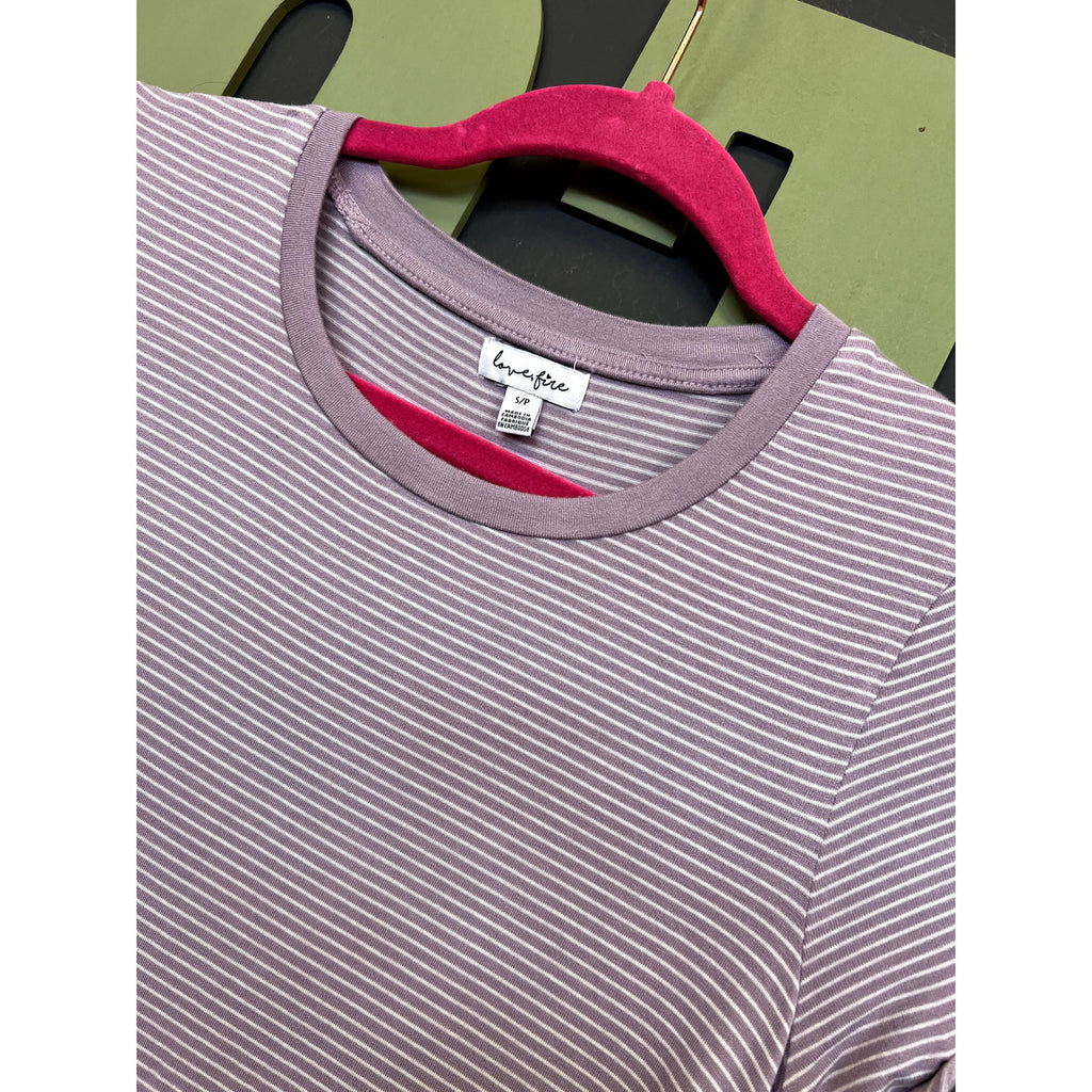 This Love Fire mini dress in light purple and white stripes is a playful and casual piece perfect for warm-weather days. The short sleeves and crew neck create a classic, comfortable silhouette that’s easy to wear.