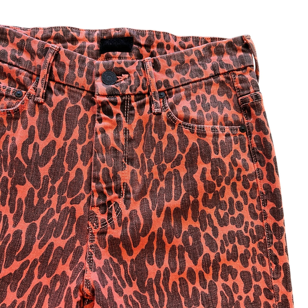 The Mother Denim Orange Leopard High Rise Ankle Frayed Jeans are a bold and playful take on classic denim. With a high-rise fit, they sit comfortably at the waist, creating a flattering silhouette. The standout feature is the vibrant orange leopard print, which adds a fun, wild twist to the classic denim look. The ankle-length cut is perfect for showing off your footwear, while the frayed hem adds an edgy, unfinished touch. Made from soft, stretchy denim, these jeans offer both style and comfort, making them a statement piece that can be dressed up or down for any occasion.
