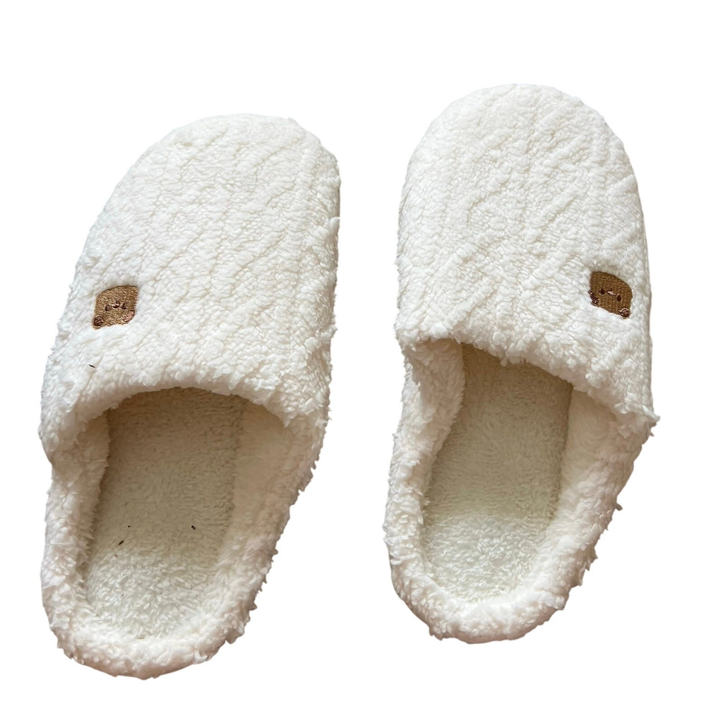 These women’s ivory cable knit slippers combine cozy comfort with a touch of playful charm. The soft knit keeps your feet warm, while the small embroidered bear on each slipper adds a subtle, whimsical detail.