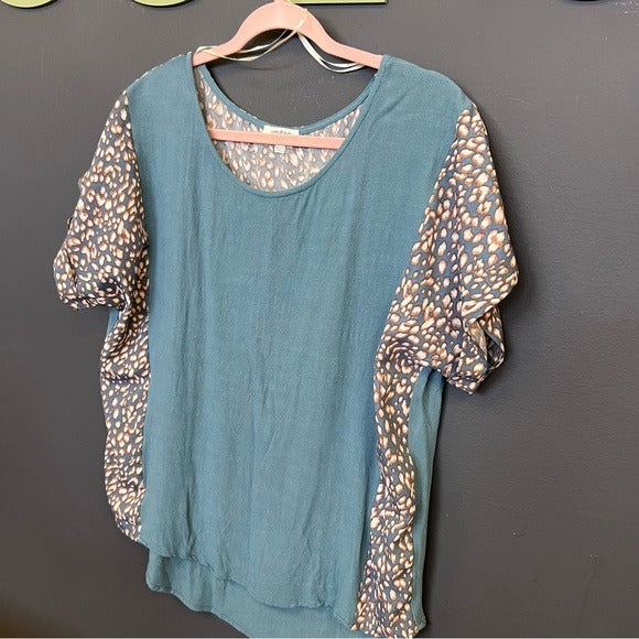 Umgee Scoop Neck Denim Blue + Leopard Flowy Blouse Size Large