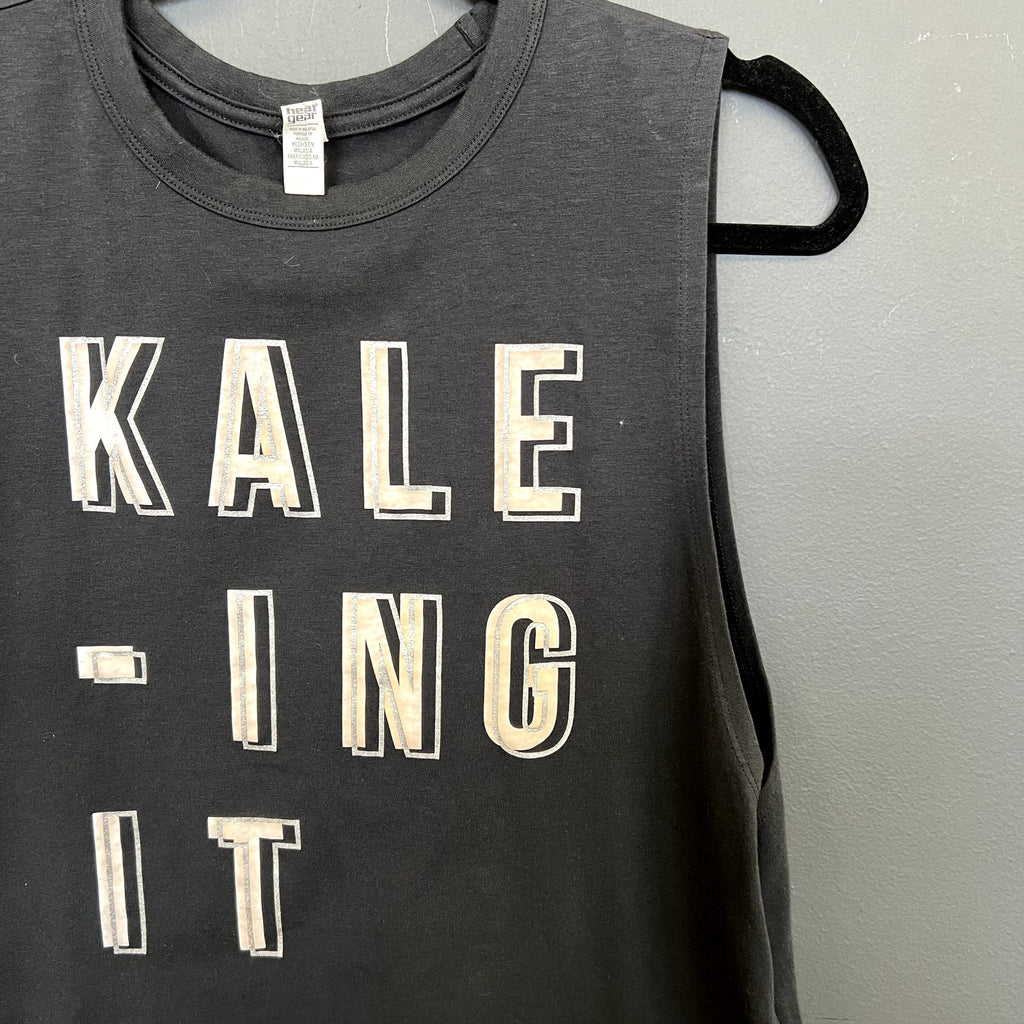 Get ready to flex those muscles and show off your playful side with the Under Armour "Kale-ing It" Tank! This black muscle tank features the fun and sassy “Kale-ing It” graphic in bold white letters, so you can sport your love for greens while you work up a sweat. The loose, relaxed fit ensures freedom of movement, while the breathable fabric keeps you cool and comfortable through every rep, run, or rest day.