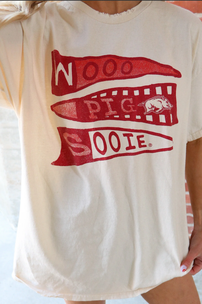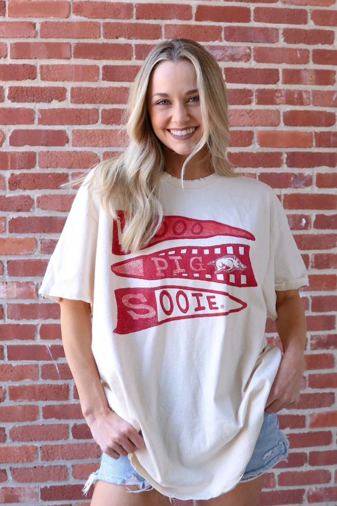 Show your Arkansas pride with vintage flair! This ivory thrifted-style tee features retro pennants across the front, each waving bold Arkansas spirit. With its soft, worn-in feel and timeless design, it’s perfect for pairing with jeans, shorts, or your favorite game day skirt.