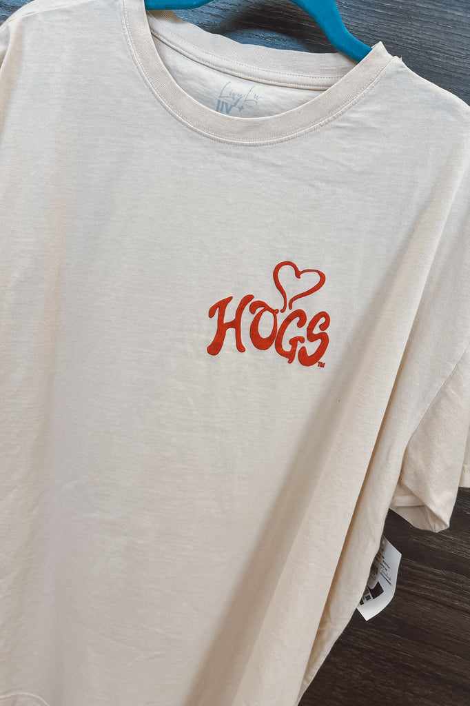Game day just got cuter! This ivory tee brings the spirit with puff-ink ‘HOGS’ across the chest and a bold ‘WOO PIG SOOIE’ blasting across the back. Soft, classic fit with a playful pop of texture—perfect for tailgates, stadium seats, or just repping your team in style!
