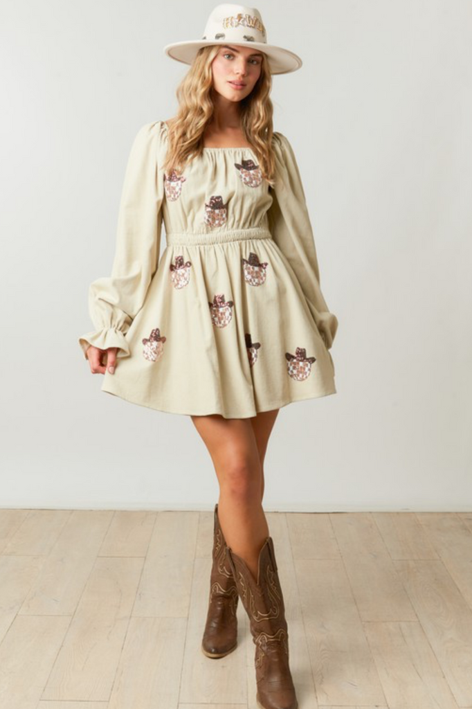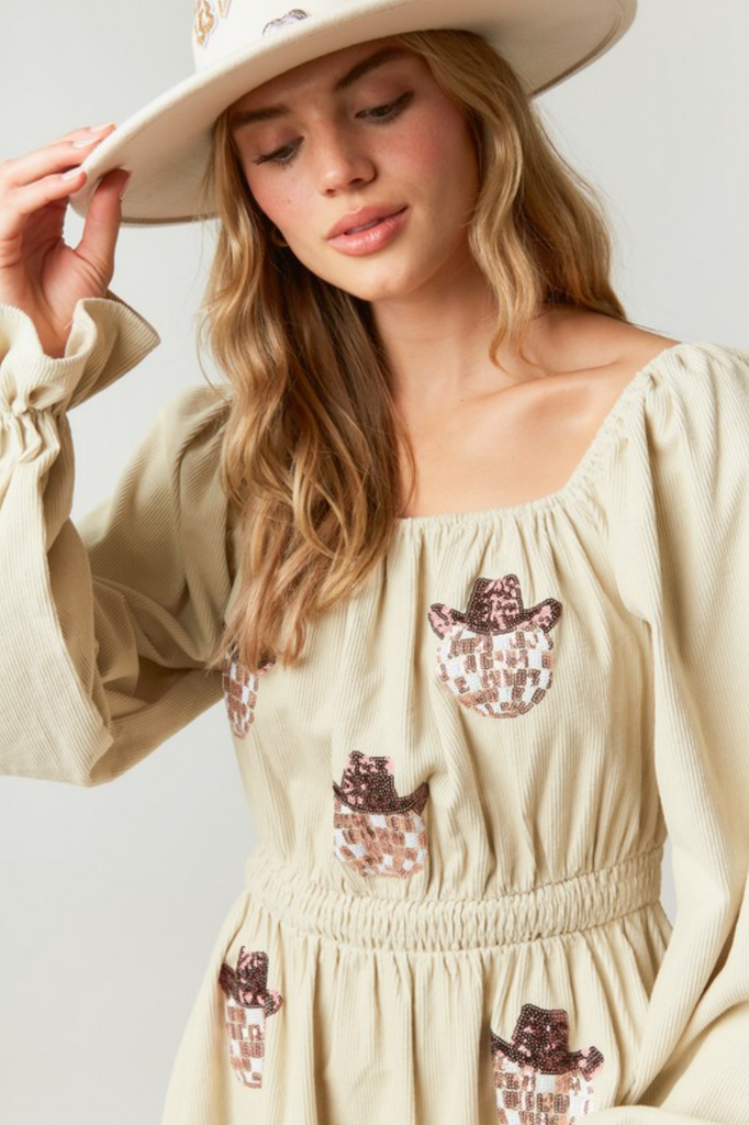 Shine bright and dance the night away in this ivory corduroy dress that’s equal parts playful and chic. The square neckline and bubble sleeves give it a flirty, boutique-ready silhouette, while the elastic cinched waist creates a flattering fit that moves with you. Wear it on or off the shoulder depending on your mood for a little extra versatility.