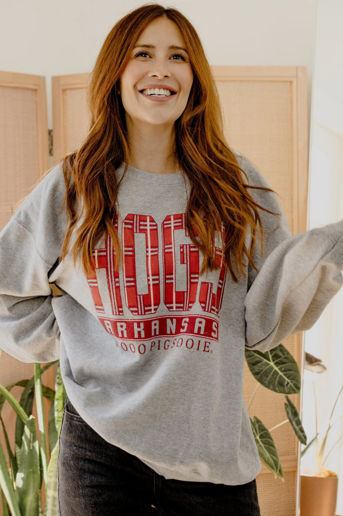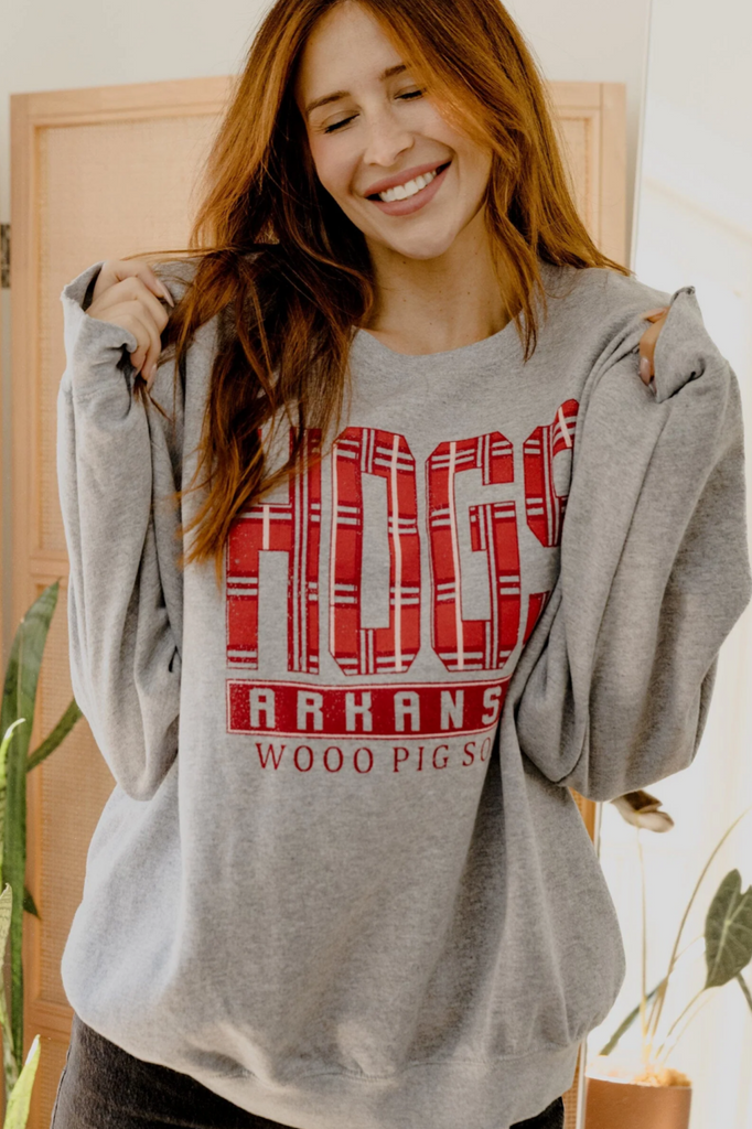 Keep it simple and spirited!! This gray thrifted-fit sweatshirt features “HOGS” in bold preppy red across the front, blending comfort with classic Arkansas pride!! Perfect for cheering on the Razorbacks, layering on cool days, or adding a pop of school spirit to your casual looks!!