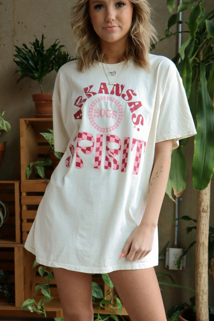 Keep it playful and spirited in this ivory thrifted-style tee, topped with a fun red and pink Arkansas Hogs graphic across the front. With its vintage feel and bold pop of color, this tee is the perfect mix of casual comfort and Razorback pride — ready for every game day tradition.