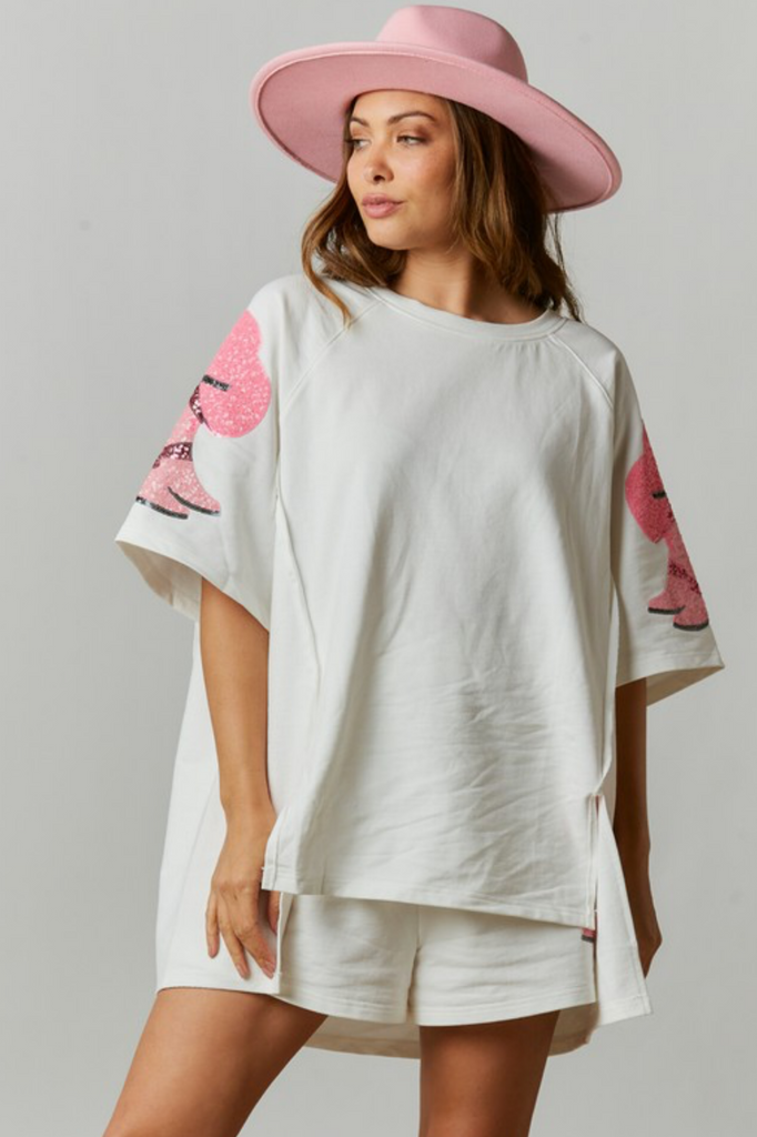 Bring the party wherever you go in this oversized white top that was made for girls’ trips and dance floors. The relaxed, baggy fit and trendy high-low hem with side slits give it that effortless feel, while the real star of the show is the pink sequin cowgirl boot on the sleeves, complete with darker pink sequin fringe that moves when you do.
